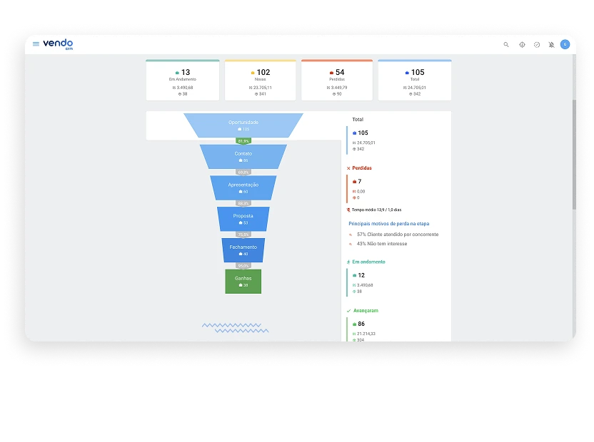 Para obter estas informações e indicadores, o Vendo CRM dispõe de relatórios, analisador de funil e tabela pivô.