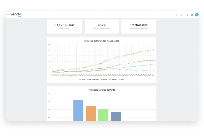 No Vendo CRM, as ações operacionais do dia a dia, como, cadastro de negociações, cadastro de produtos vendidos em uma negociação, cadastro de atividades na agenda, são dados para a criação de informações e indicadores valiosos para a tomada de decisão e entendimento de particularidades do seu negócio. Aqui podemos listar alguns: