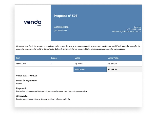 Faça download da proposta em PDF para você enviar para os seus clientes. Isso auxilia você e sua equipe a enviar uma proposta padronizada e com mais agilidade.