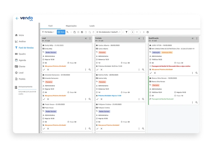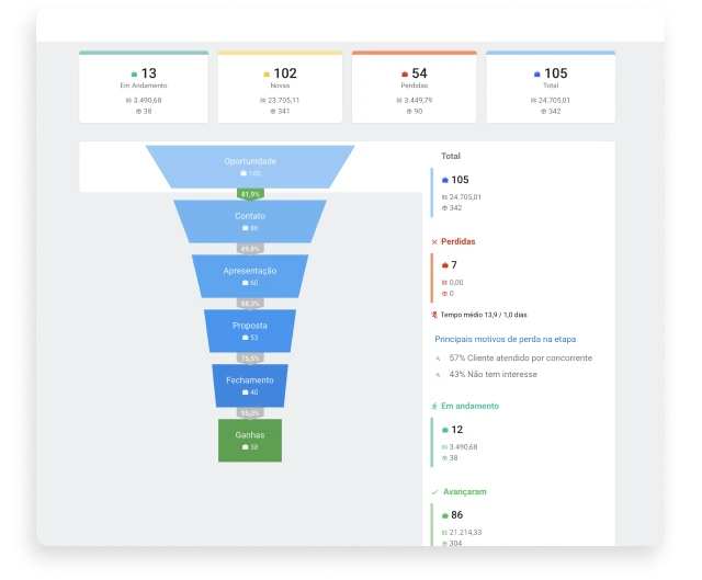 Organize suas negociações com um funil de vendas e tenha clareza do processo e do trabalho que você executa no dia a dia, trazendo organização e visibilidade das informações dos seus clientes, seja você um gestor, líder de equipe ou vendedor.