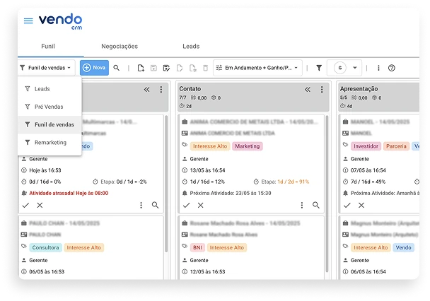 Com o Vendo CRM, você pode ter múltiplos funis de vendas e neles você pode customizar: