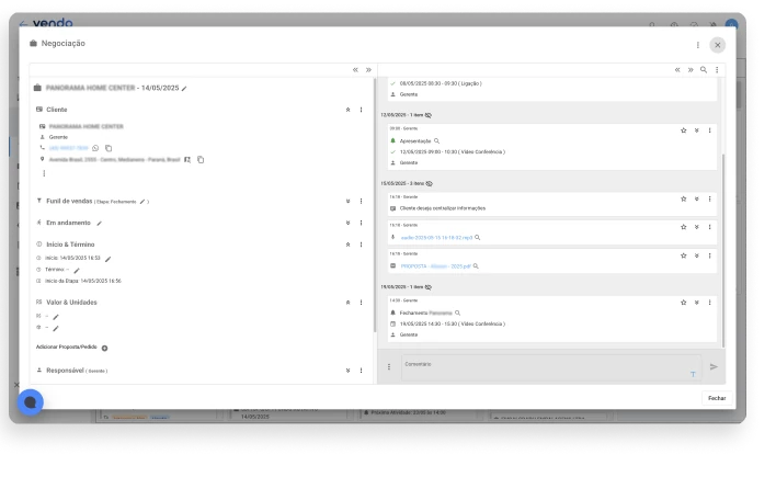 Na negociação, você conta com uma linha do tempo que possibilita adicionar comentários, anexos, áudios e lembretes.